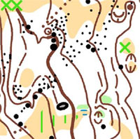 La carrera es en la parte oeste del mapa del domingo pasado en la Liga Norte. La zona tiene desnivel y bastante vegetación, carrera de fuerza. Elementos de relieve grandes y piedras concentradas en zonas.